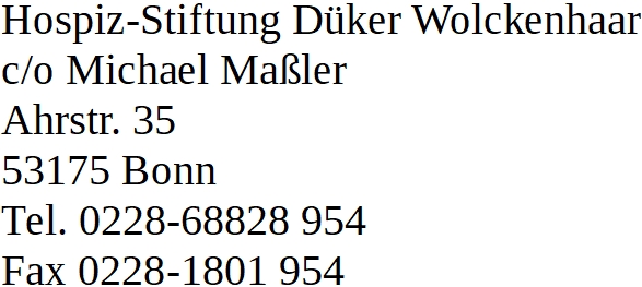 Soweit dieses Angebot Links zu externen Webseiten Dritter enthält, hat die Hospiz-Stiftung auf deren Inhalte keinen Einfluss und übernimmt dafür keine Haftung. Für die Inhalte der verlinkten Seiten ist ausschließlich der jeweilige Anbieter oder Betreiber der Seiten verantwortlich. Die verlinkten Seiten wurden zum Zeitpunkt der Verlinkung auf mögliche Rechtsverstöße überprüft. Rechtswidrige Inhalte waren zum Zeitpunkt der Verlinkung nicht erkennbar. Eine permanente inhaltliche Kontrolle der verlinkten Seiten ist jedoch ohne konkrete Anhaltspunkte einer Rechtsverletzung nicht zumutbar. Bei Bekanntwerden von Rechtsverletzungen werden derartige Links umgehend entfernt.